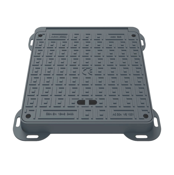 Poklop z tvárnej liatiny s rámom, pántom a tesnením EPDM proti zatekaniu vody a tlmenie nárazov, uzamykateľný sa používa na zakrytie kanalizačných revíznych šachiet. Ponúkaný poklop je dostupný vo variantoch od 600 x 600 po 600 x 900 (svetlý rozmer) s možnosťou pridania hlavice na odvetranie.